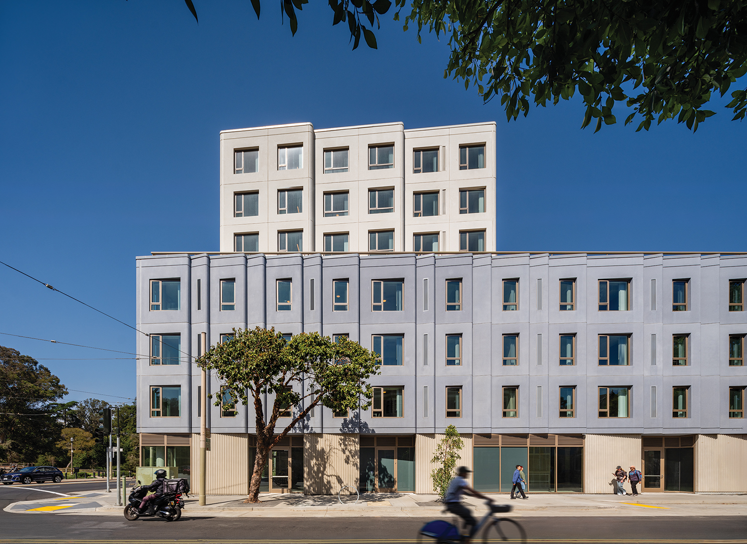 New construction of an eight-story mixed-use residential community with 190 units, 25% of which is set aside for formerly homeless families. The development will include on-site property management, tenant services, a community room, and ground floor community and commercial spaces.